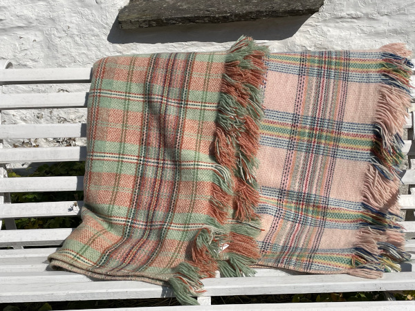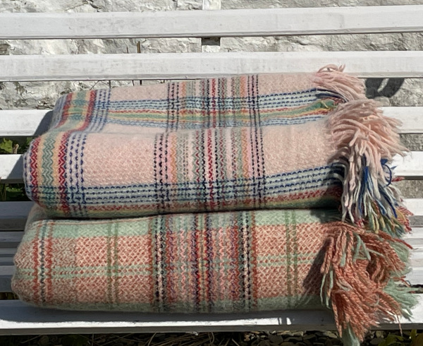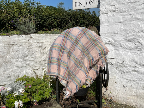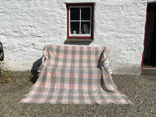Beautiful Welsh fringed blanket in a very pale shell pink with brighter crossover stripes including bright blue , post box red , yellow and green.