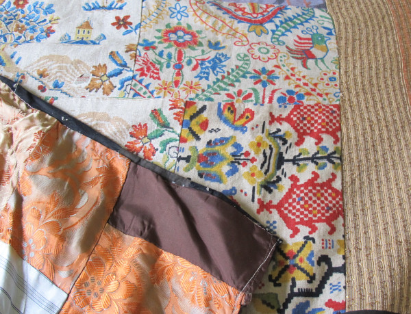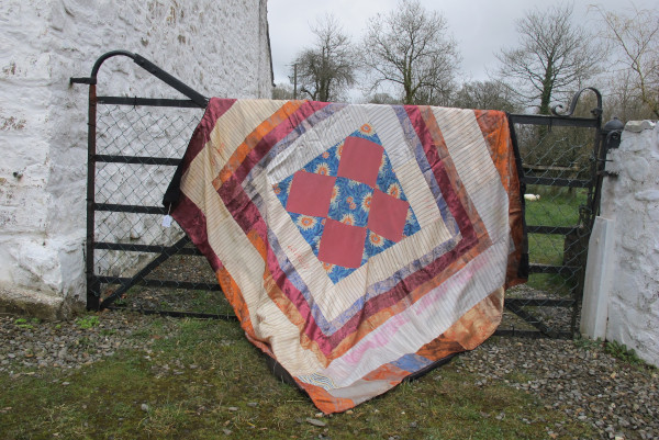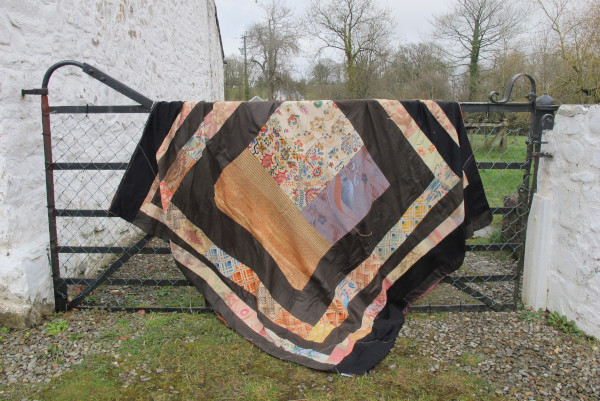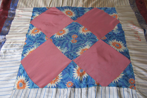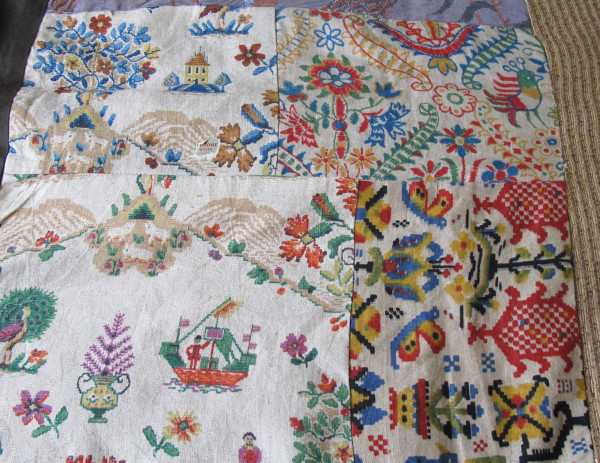 Some interesting fabrics , some figurative , others with markings that signify the ends of a roll , a utility piece, made from oddments and left overs - a sign of the times , which if it had been finished we may have referred to as a 'country' patchwork.